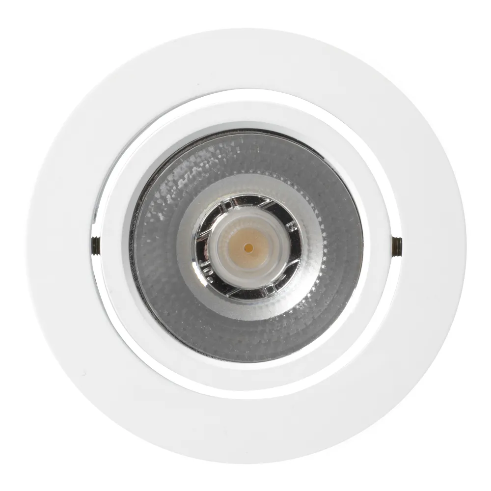 Врезной круглый мебельный светильник 5Вт, корпус белый алюминий. Цвет БЕЛЫЙ 6000K. Светодиод 1х5W Bridgelux. CRI>80, Св.поток 350-400лм, наклоняемая ось, угол 10°. Питание 110-240VAC, 5Вт, 400mA 11-13V, драйвер в комплекте. Размеры d65x20 мм, врезное отверстие d55 мм.