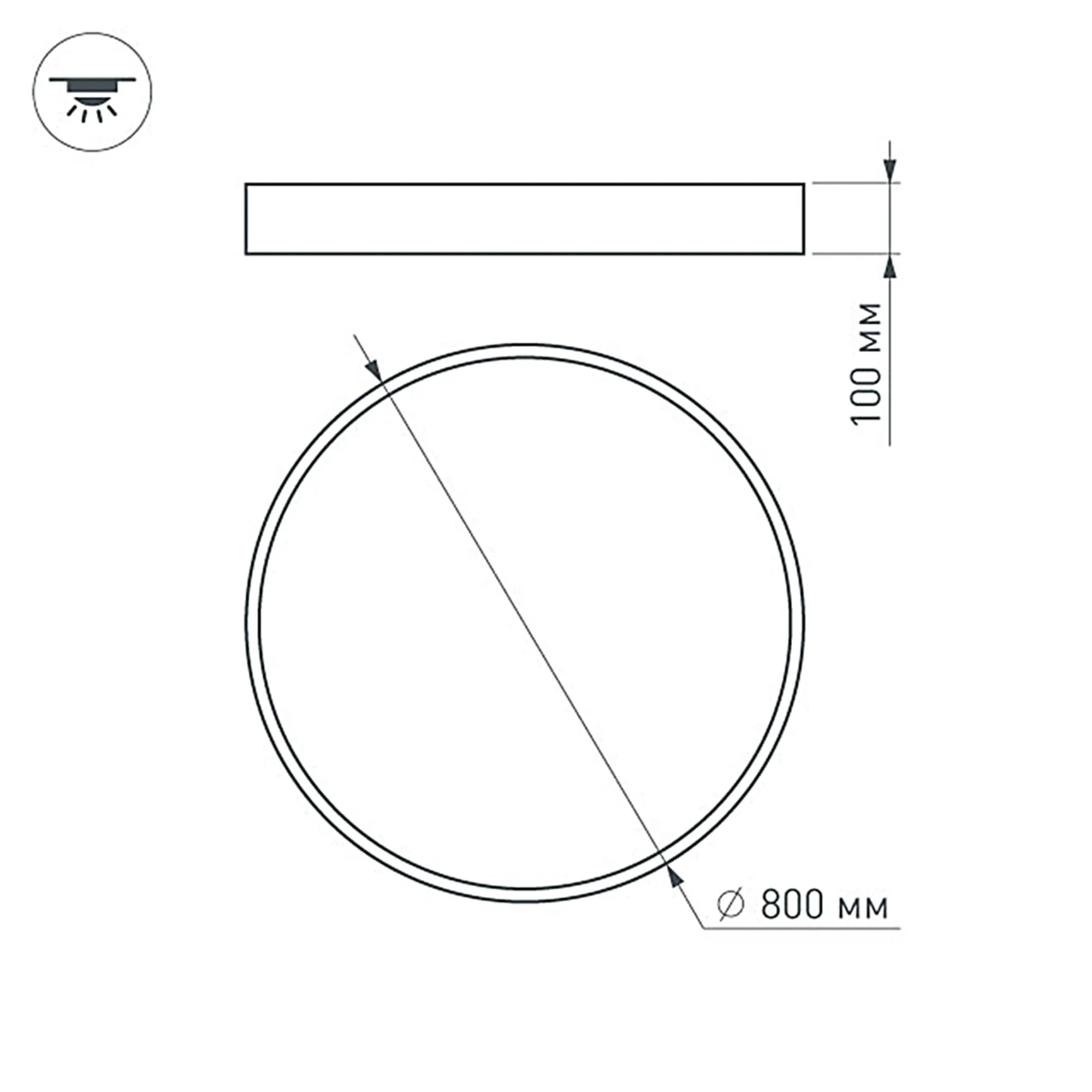 Накладной интерьерный светильник. Мощность 94 Вт, св. поток 8460 лм, 90 лм/Вт, теплый 3000 K, CRI>80, угол 120°, напряжение питания 230 В. Черный круглый корпус из алюминия, степень защиты IP20. Размер: диаметр 800 мм, высота 100 мм. Монтаж накладной. Драйвер 28-42 В, 1200 мА (2 шт.), пульсация <5%.
