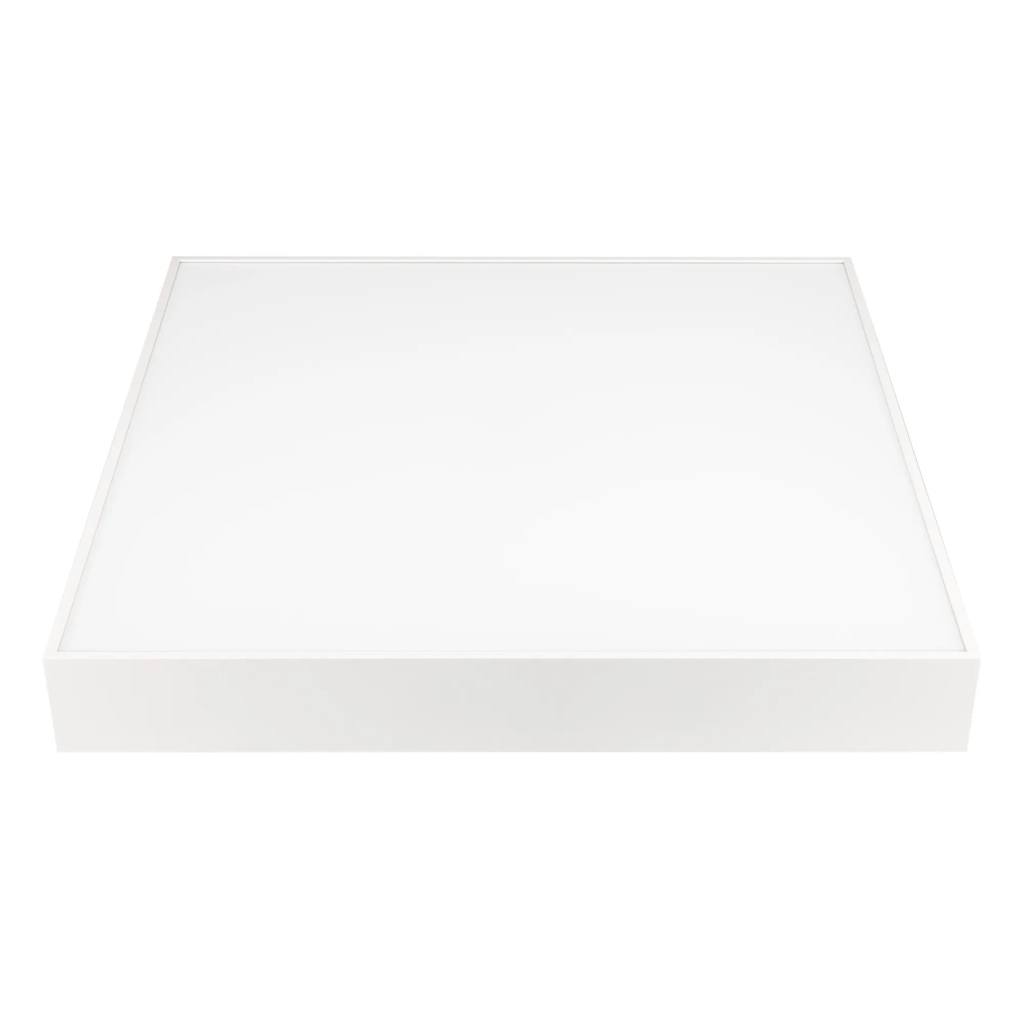 Накладной светильник. Мощность 50 Вт, св. поток 4100-4400 лм, 80-90 лм/Вт, дневной 4000 K, CRI>90, угол 120°, напряжение питания 230 В. Белый квадратный корпус из алюминия, экран PC, степень защиты IP40. Размер: длина 500 мм, ширина 500 мм, высота 64 мм. Монтаж накладной. Драйвер 27-42 В, 1200 мА, пульсация <5%.
