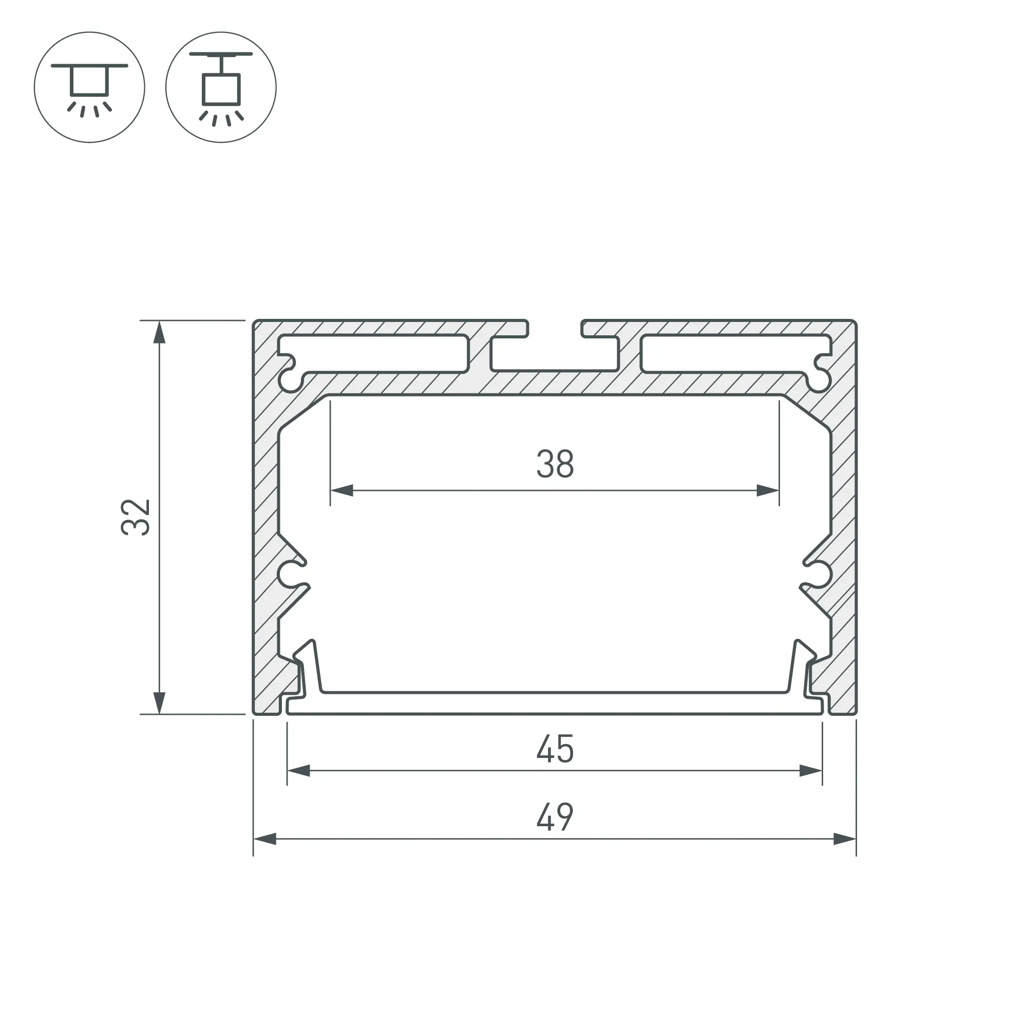 Алюминиевый анодированный профиль для светодиодных лент и линеек. Габаритные размеры (L×W×H): 2500x49x32 мм. Ширина площадки для ленты 38 мм. Экраны, заглушки и другие аксессуары приобретаются отдельно. Цена за 1 метр.