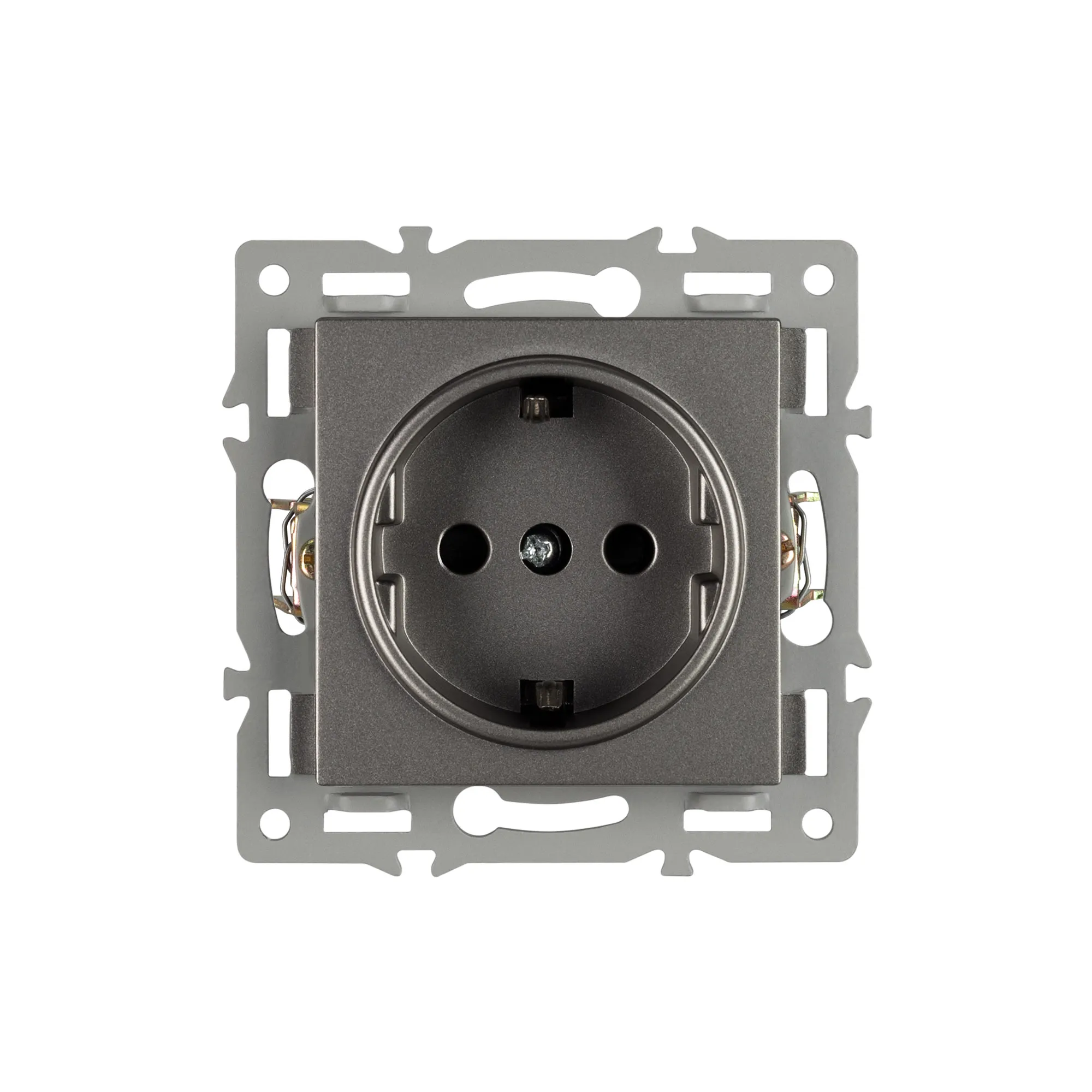 Механизм розетки с заземлением 1 пост, с суппортом из алюминия. Цвет - серый. Степень пылевлагозащиты - IP20.