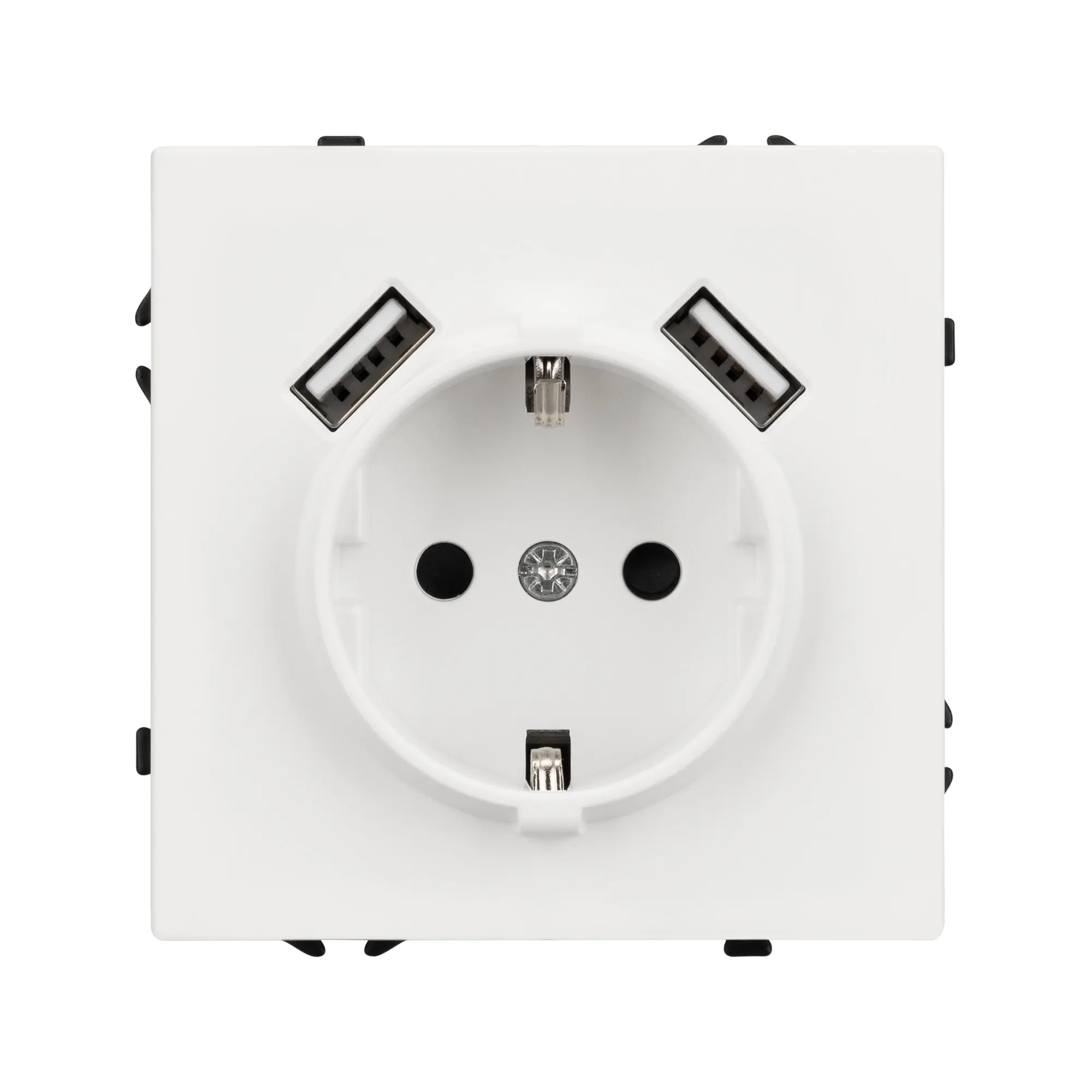 Механизм розетки с заземлением на 1 пост и 2USB Type A порта. Цвет - белый кварц, с Soft-Touch покрытием. Без фронтальной рамки. Уровень пылевлагозащиты IP20. Розетка устанавливается в стандартный подрозетник круглого сечения диаметром 60мм.